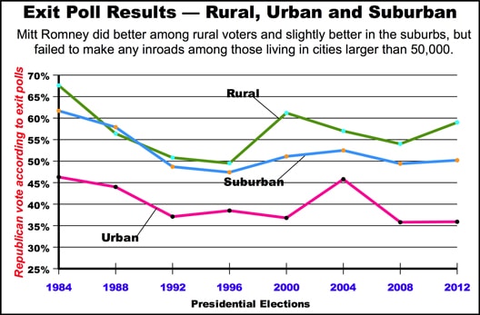 But Obama maintained his lead in the cities. Romney won only 35.9 percent of the vote in urban areas, no better than McCain’s vote in 2008 and well below George Bush’s 45.8 percent in 2004.
